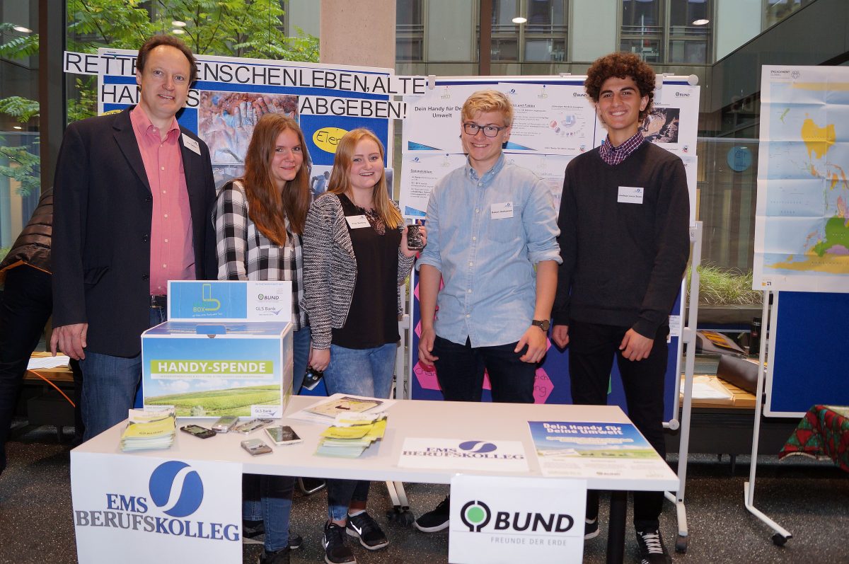 Rund zwei Milliarden Handys bzw. Smartphones gibt es weltweit, etwa 40 Millionen in Deutschland. Die Nutzungsdauer liegt durchschnittlich nur bei 18 Monaten – und da beginnt das Problem: Es entstehen Massen von Elektroschrott. Dass die Produktion und Entsorgung von Handys mit vielen sozialen und ökologischen Problemen verbunden sind, hat die Klasse HH64 der Höheren Handelsschule am Ems-Berufskolleg thematisiert und die Ergebnisse bei der „Klimawoche“ an der Fachhochschule Bielefeld präsentiert. Fachlehrer Dirk Deleré hat die Schüler für dieses Thema – unter dem Motto „Ems-BK goes green“- sensibilisiert. „Bei den Recherchen zum Thema haben wir viel Neues erfahren“, berichtet Schülerin Finja Barking: „In asiatischen oder afrikanischen Ländern erfolgt das Recycling unter sehr schlechten Bedingungen. Ohne Schutzvorrichtung werden Handys und andere Elektrogeräte demontiert; einzelne Metalle werden chemisch oder per Verbrennung aus den Geräten gelöst. Auch Elektroschrott-Importe aus den Industrieländern führen zu großen Problemen.“ Deutschland ist dabei mit einer Menge von 21,7 Kilogramm Elektroschrott „Spitzenreiter“ in Europa. Am Ems-Berufskolleg haben die Schüler der Klasse HH64 ihr Projekt in den einzelnen Klassen vorgestellt und alte Handys eingesammelt. Pro Handy wurde jeweils ein Euro für ein Umweltschutzprojekt des BUND gespendet. Neben dem Ems-Berufskolleg waren bei der „Klimawoche Bielefeld“ rund 25 Schulen sowie weitere Aussteller aus Ostwestfalen-Lippe mit Projekten zum Klima- und Naturschutz vertreten. „Für uns war es auch eine besondere Erfahrung, dass wir unsere Ergebnisse vor fremden Schülern, Lehrern und sogar Uni-Dozenten halten konnten“, lautete das positive Fazit von Schülerin Jessica Stüker.
