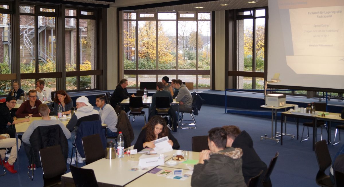 Am 16.11.2017 war es wieder soweit: Das jährliche Speed-Dating der Unterstufenklassen der Lagerlogistik fand von 7.30 Uhr bis 12.30 Uhr in der Aula des Ems-Berufskollegs statt. Hier konnte zwar nicht, wie der Begriff „Speed-Dating“ vermuten lässt, der Partner bzw. die Partnerin fürs Leben gefunden werden, sondern die Schülerinnen und Schüler hatten vielmehr die Möglichkeit, ihren Partner für die Ausbildungszeit kennenzulernen und diesen mit einem selbst erstellten Fragenka-talog wissbegierig zu befragen.
