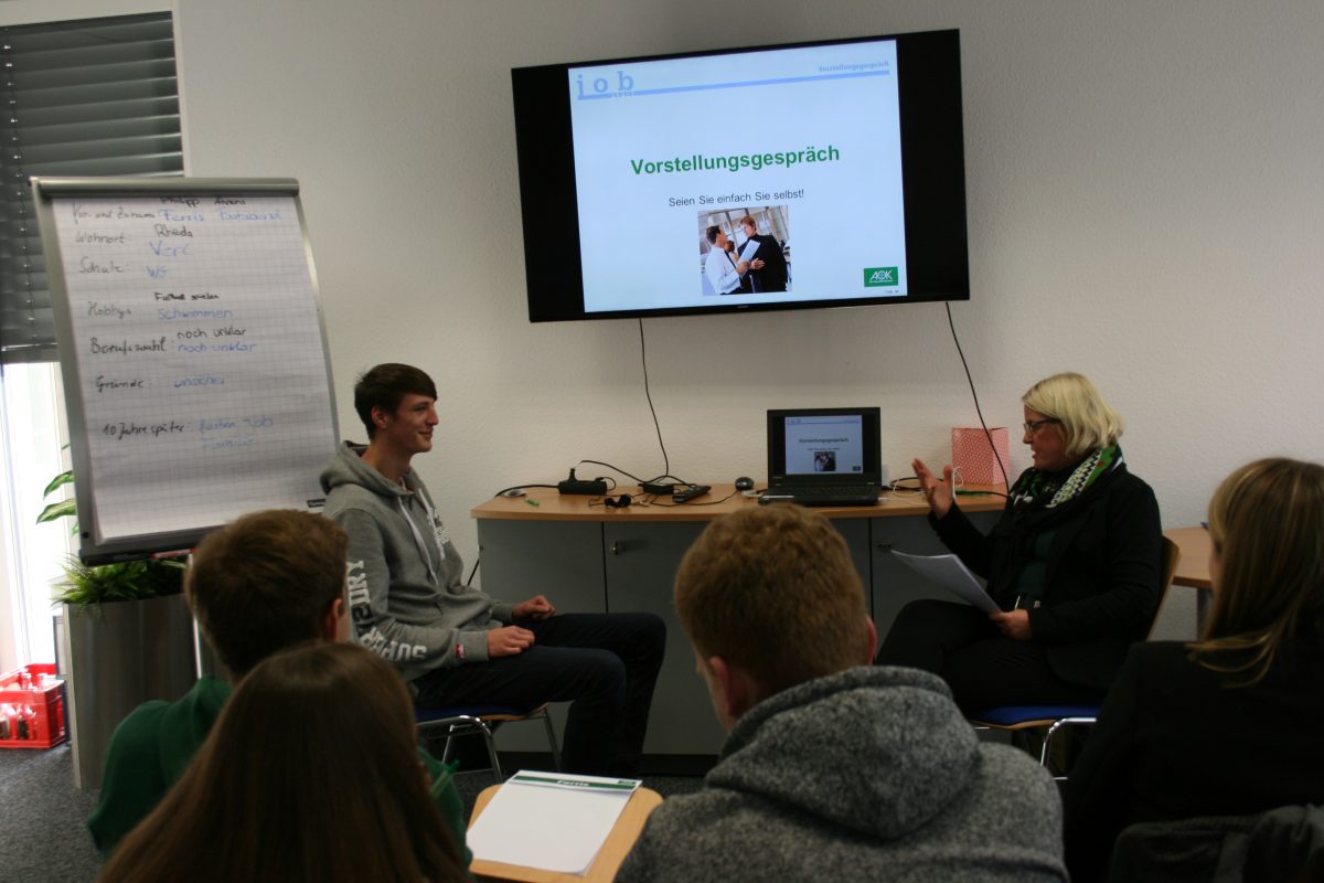 Das erste Halbjahr der Qualifizierungsphase ist fast geschafft. Die Mittelstufenklasse des Wirtschaftsgymnasiums unter Leitung von Herrn Richter nimmt zusätzlich bereits jetzt an zahlreichen Aktivitäten teil, um den Übergang vom Abitur in das Studium oder die Ausbildung zu erleichtern. So finden Projekte wie z.B. Umgangsformen im Berufsleben, Betriebsbesichtigungen und Wirtschaftsplanspiele in Kooperation mit kompetenten Partnern statt. Kurz vor Halbjahresende besuchen die Schülerinnen und Schüler noch zusammen mit ihrer Klassenlehrerin Frau Stork ein Bewerbungstraining bei der AOK in Rheda-Wiedenbrück und den Infotag der Universität Paderborn.