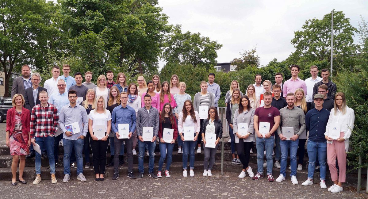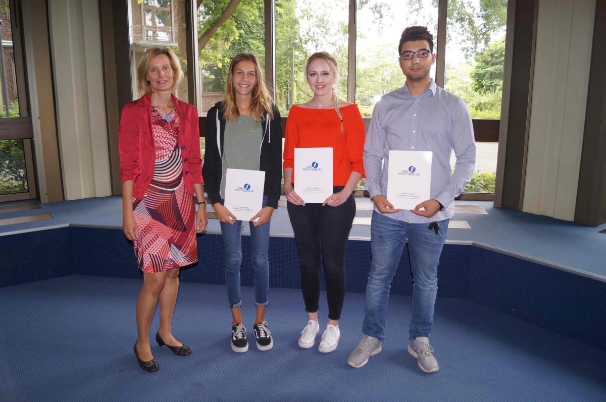 45 angehende Industriekaufleute wurden jetzt am Ems-Berufskolleg anlässlich ihres letzten Berufsschultages in einer Feierstunde in der Aula verabschiedet. Aus den Händen ihrer Klassenlehrer erhielten sie ihre Berufsschulabschlusszeugnisse. Bildungsgangleiterin Tanja Bans blickte in ihrer Rede auf die Anforderungen der drei Ausbildungsjahre zurück, in denen viele Erfahrungen im Beruf gesammelt und auch schwierige Situationen gemeistert wurden. „Wenn Sie demnächst die praktischen Prüfungen absolviert haben, beginnt für Sie wieder ein neuer Lebensabschnitt mit Perspektiven in anderen Betrieben, Branchen, einer Zusatzqualifikation oder einem Studium“, so die Bildungsgangleiterin. „Behalten Sie Ihre Ausbildungsschule in guter Erinnerung, und vielleicht hören wir nochmals von Ihnen.“ Besondere Erwähnung fanden die Leistungen der Klassenbesten Michelle Küster (Klasse IN 51), Sophie Böltner und Najim Moukhtari (Klasse IN 52) sowie Leonie Karaula (Klasse IN63V);