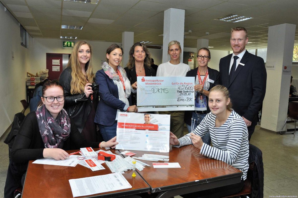 Fast 500 Schüler des Ems-Berufskollegs haben sich jetzt bei der Deutschen Knochenmarkspenderdatei (DKMS) registrieren lassen. Mit dabei war auch eine Bloggerin, die das Ganze mit der Kamera festhielt. Der Anlass ist – wie bei solchen Aktionen meist – ein trauriger. „Die Schwester einer Kollegin leidet an Blutkrebs“, sagte Lehrerin Stephanie Drees, die die Typisierung mit initiiert hatte. „Wir haben uns mit den Schülern mehrere Wochen darauf vorbereitet“, sagte sie. Eigentlich kostet die Registrierung bei der DKMS 35 Euro. Damit aber auch Schüler mitmachen können, hat die gemeinnützige Organisation einen Fonds eingerichtet. „Der soll, wenn möglich, im Anschluss auch wieder mit Geld gefüllt werden“, erklärte die Lehrerin. Deswegen haben die Schüler und das Kollegium eine Spendendose aufgestellt, Kuchen verkauft und eine Tombola organisiert. Unterstützt wurden sie finanziell unter anderem von der Kreissparkasse Wiedenbrück. Dabei kamen 2600 Euro zusammen, die an die Vertreter der DKMS übergeben wurden.
