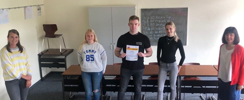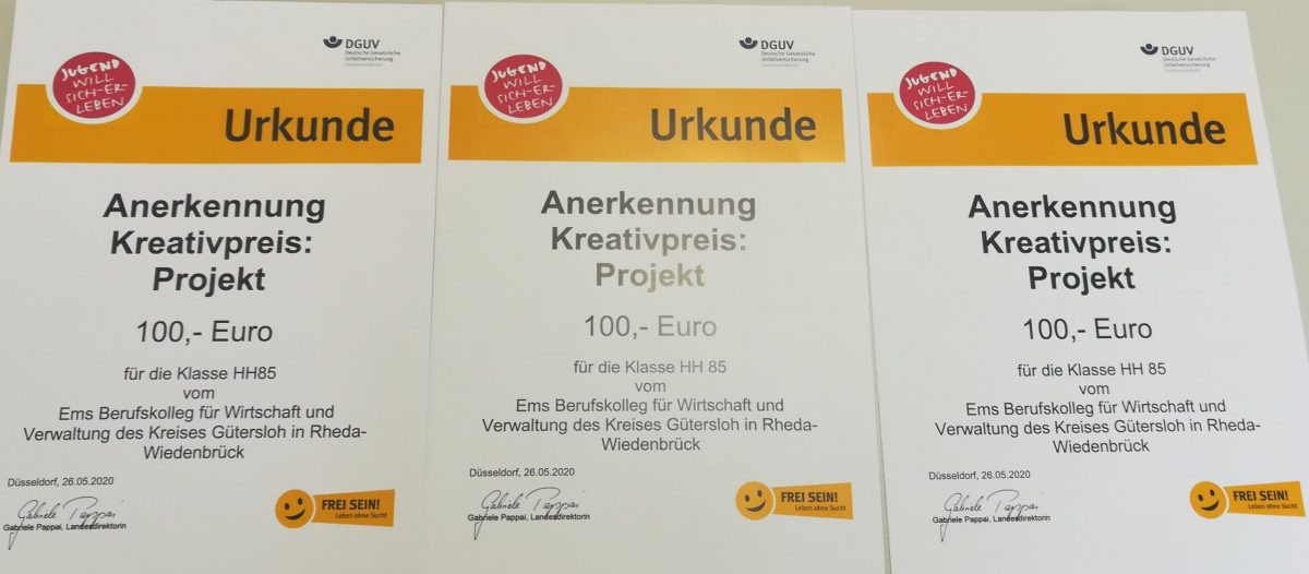 Zum ersten Mal haben sich die Oberstufen der Höheren Handelsschulen im Schuljahr 2019/20 am Kreativwettbewerb der Deutschen Gesetzlichen Unfallversicherung beteiligt und gleich mehrere Preise gewonnen. Die Klassen hatten sich mit ihren Religionslehrern Steffen Schulz und Petra Habenicht im Unterricht mit dem Thema „Frei sein! – Leben ohne Sucht“ beschäftigt. – In der HH 86 erreichten Luna Hartmann, Madita Hollenhorst und Erik Schramm mit ihrem Beitrag zur Mediensucht den vierten Platz in NRW und erhielten für die Klasse ein Preisgeld von 350 €. In der HH 85 hatten sich mehrere Schüler und Schülerinnen mit unterschiedlichen Beiträgen beteiligt, und jeweils drei Resultate haben einen Anerkennungspreis mit je 100 € gewonnen. Alle Klassen hatten außerdem am Quiz über die Ursachen und Folgen von Sucht teilgenommen, und zu den ausgelosten Preisträgern gehört Maximilian Lefeld aus der Klasse HH 82. Die beiden Religionslehrer, aber auch die Klassenlehrer, sind stolz auf die Leistungen der Schüler.
