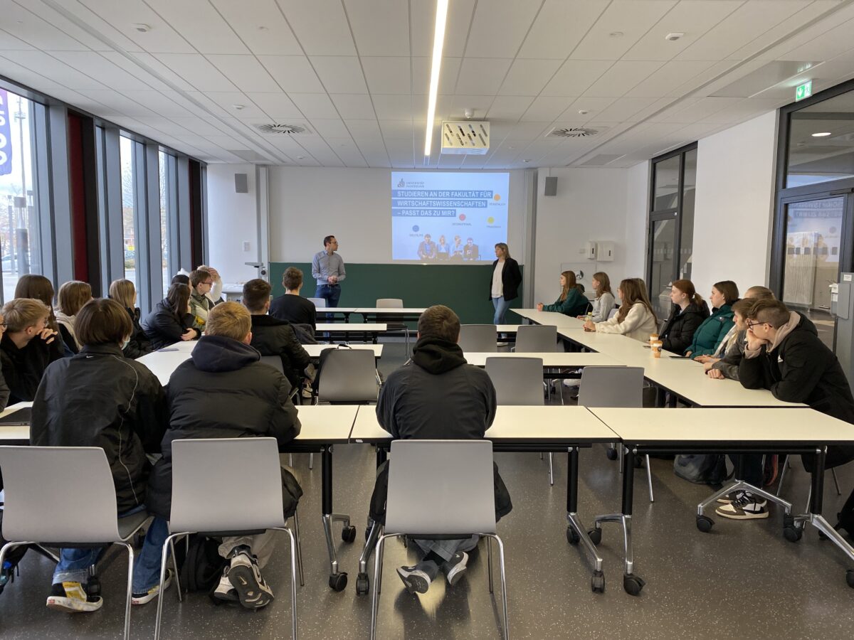 Anschließend lernten die Schüler*innen unter Leitung der wissenschaftlichen Mitarbeiter*in Frau Lopadin und Herrn Buck die verschiedenen Studienangebote der Fakultät Wirtschaftswissenschaften an der Uni Paderborn kennen und analysierten in einem Workshop (siehe Foto) anspruchsvolle Texte. Mit einem gemeinsamen Mittagessen endete die interessante Veranstaltung.