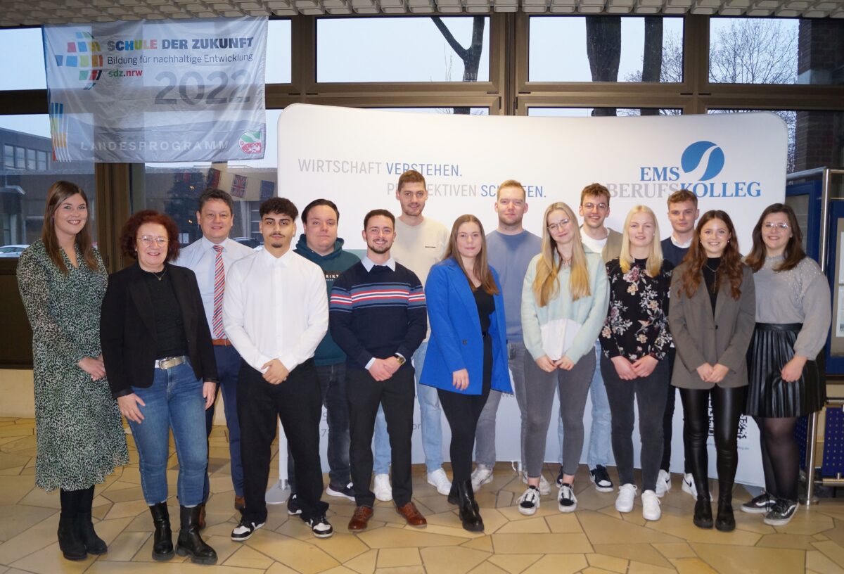Nach erfolgreicher Ausbildung und den schriftlichen Abschlussprüfungen sind jetzt 12 Absolventinnen und Absolventen der Klasse GH02v aus regionalen Groß- und Außenhandelsunternehmen am Ems-Berufskolleg verabschiedet worden. Sie bewältigten die Anforderungen sogar in der verkürzten Ausbildungszeit von zweieinhalb Jahren. Klassenlehrerin Andrea Gerwing und der stellvertretende Schulleiter Achim Wörmann sprachen allen Absolventen ihre Glückwünsche und Anerkennung aus und erinnerten an gemeinsame Aktivitäten in der Ausbildungszeit: ein mehrtägiges Europa-Seminar in Brüssel und Praxiserkundungen in regionalen Unternehmen. Auch die Klassensprecher Raphael Uliczek und Patrick Bischoff blickten auf die Schul- bzw. Ausbildungszeit zurück und lobten das gemeinsame Miteinander im Klassenverband und das Engagement ihrer Klassenlehrerin: „Wir sind uns einig, dass wir die Ausbildung in diesem Klassenverband und unter dieser Leitung so jederzeit wieder beginnen würden“, lautete das positive Fazit der Klassensprecher. Die Bedeutungen des Wortes Kompliment fasste Andrea Gerwing als Klassenlehrerin und Bildungsgangleiterin in ihrer Rede als „Blumenstrauß an Lob und Anerkennung“ an die Klasse zusammen, auch mit Bezug auf die Herausforderungen des Online-Unterrichts in der Corona-Zeit: „Mit keiner anderen Klasse konnte ich so gut auf Distanz Unterricht machen wie mit Ihnen, es war fast, als würden wir zusammen im Klassenraum sitzen.“ Besonders gewürdigt wurden die Leistungen der Klassenbesten Lea Busche (1,0) von der Nüßing GmbH und Patrick Bischoff (1,3) von der Lüning Ladenbau GmbH.