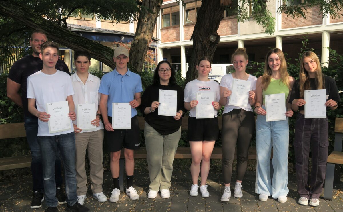 In der Klasse WG11 haben acht Schülerinnen und Schüler das TELC Business Certificate erworben: Alexander Combrink, Kilian Janzen, Sam Koch, Gizem Bilican, Laura Rath, Klara Gieras, Theresa Westmeyer, Josephine Eustermann (von links). Es ist ein skaliertes Zertifikat auf dem Sprachniveau B2-C1. Zunächst musste eine 170-minütige schriftliche Prüfung abgelegt werden, die die Kompetenzen Hörverstehen, Lesen, Sprachbausteine und schriftlicher Ausdruck umfasst. Im Anschluss fand eine 20-minütige mündliche Prüfung statt, die aus einer Präsentation und einer Fragerunde bestand.
