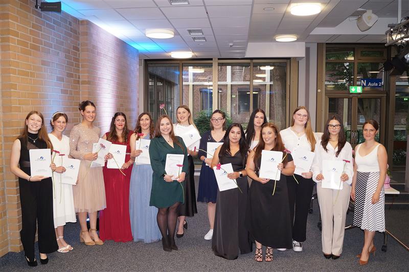 In der Ausbildung hat sich gezeigt, dass die Potenziale manchmal geweckt werden müssen, um sich zu entfalten.“ Die Klassenlehrerinnen Sandra Stork und Rachel Kohl blickten in ihrer Ansprache auf die Ausbildungszeit zurück. Die langen Arbeitstage in der Arztpraxis habe man manchmal in der Schule an den Gesichtern ablesen können, doch die Absolventinnen hätten ihre fachlichen und persönliche Stärken weiterentwickelt. Der Beruf biete viele Weiterbildungsmöglichkeiten: „Ihre Reise ist noch nicht zu Ende.“ Für die besten Berufsschulzeugnisse wurden Valerie Steinberg (1,0) und Fiona Hesse (1,1) besonders geehrt; die besten Prüfungsnoten erzielten Fiona Hesse (1,2), Jana Mironow (1,3) und Valerie Steinberg (1,4). Die Absolventinnen bedankten sich bei ihren Lehrkräften für die gute Vorbereitung, Unterstützung und Geduld. Musikalisch abgerundet wurde die Zeugnisfeier durch Sänger Jan Böske sowie den abschließenden Ausklang mit kleinem Umtrunk.